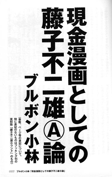 豪華執筆人の中でも、ブルボン自身の長編評論『現金漫画としての藤子不二雄(A)論』が秀逸である。藤子マンガの現金の精緻な描写が作者の現実性、素直さの現れであると評している。マンガ登場実物といえども、現金がないことには物語が展開しないのである。ここに読者の共鳴の要因を見出す。