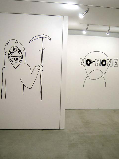 今回の展示は、ブルーニングが鉛筆で小さなグラフティ(落書き)をして、それを壁に投射し、マジックで壁にトレースしている。その作品を購入した人は、もともとの鉛筆原画と今後 壁に投射する権利を付与される(!) 逆に巨大ペーパーにトレースされた作品を購入すると、元の原画が破棄される(!)