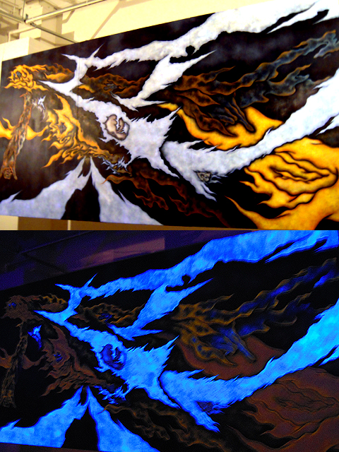 今回は、以前GEISAIで知り合った弥田真一さんから招待状をもらったので、いってきた。右の大型作品は、蛍光塗料が縫ってあり、暗くなると稲妻のごとく光るユニークな作品。他にも利休やパンクロッカーをモチーフにした独特のポートレート作品も面白い。