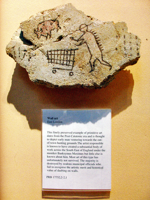 2005年5月、大英博物館に『街外れに狩りにいく古代人』という題名の遺跡のかけら(壁画の一部)を勝手に展示。遺跡にはショッピングカートを押す古代人と、カートに槍が刺さった獣が入っている絵が描かれていた。