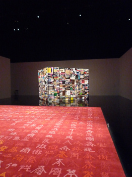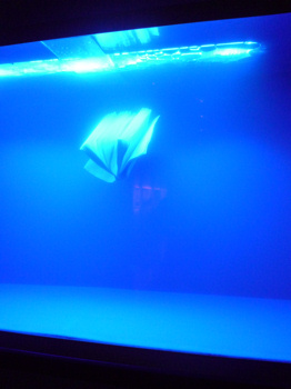 左 = リー・キーボン「バチェラー:二重の理論」。水槽の中をクラゲの如く漂う一冊の本。本がバラバラにならず、生き物のようだったので、本は生き物だと思った。