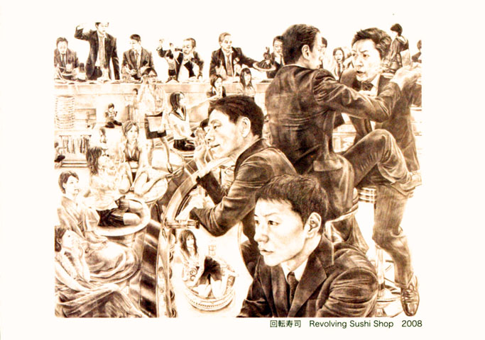 回転寿司を奪い合う人々。町を荒らす買い自由のような人々。このなんたる欲望の強さ!草食系の時代の反論のようでもある。