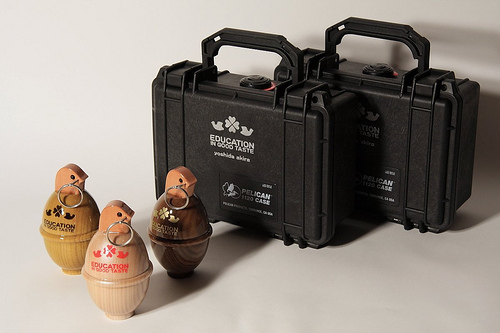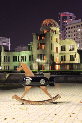 吉田朗さんの作品は、立体作品が中心。平和を願った玩具として木とFRPを組み合わせて作った木馬の胴体が爆弾になっている。黒光りした胴体にドクロが描かれている。また、仏像も日本人の宗教感覚のなさを皮肉るのではなく、自然と描いており好感がもてる。木製に鳩の柄がついた手榴弾も見事。度重なる研磨で艶やかなになった兵器のような作品群が面白い。
