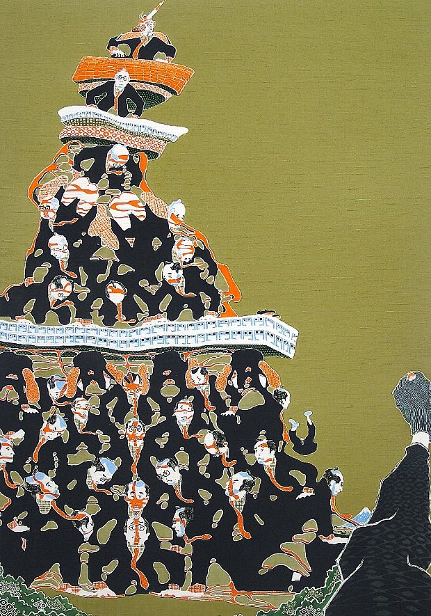 石井享さんの作品は、友禅染の手法で、現代ビジネスマンを淡々としたユーモアで描いている。もともと友禅を使ったグラフィティ系だったという。シルクの質感がなんともいえず清々しい風合いをうむ。