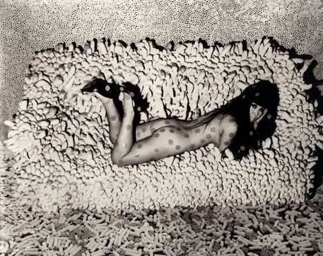 フォトコラージュ ソフトスカルプチュア「集積No2」(1962年制作)に横たわる草間。1966年 photo by Hal Reiff (C)YAYOI KUSAMA