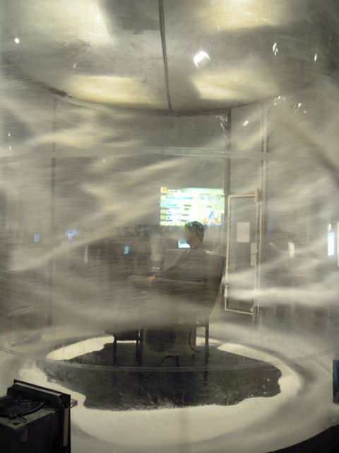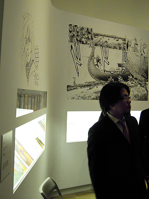 いろいろ面白い受賞作品の展示があった。右上=マンガ部門大賞の「ヴィンランド・サガ 」の著者である幸村 誠氏が展示ブースに直筆イラストを描き終わったところ。左下=アート部門 審査員推薦作「Box2」(Nika OBLAK/ Primoz NOVAK)というテレビの中の人が外に向かってボコボコに殴ってくる(笑) 中央下=アート部門優秀賞作 「Nemo Observatorium」(Lawrence MALSTAF) 白い微粒子が巨大透明シリンダーの中を待っているが、中心に座る人物には一切 風も粉もからない...不思議だ。