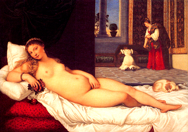 ウルビーノの、とあるが、ウルビーノが描いたのではなく、彼はパトロンてある。実際は、ティツィアーノ(Tiziano Vecellio, 1490年頃 - 1576年)という、ルネサンス期のイタリアの画家の作品である。ジョルジョーネとともにヴェネツィア派の最盛期を代表する画家。