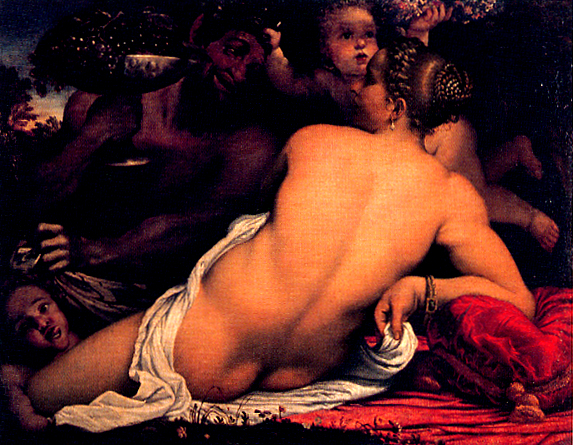 ↓ もうひとつ気になったのが、アンニバレ・カラッチが1588-89年に描いた『ヴィーナストサテュロス、小サテュロス、プットー』という作品。