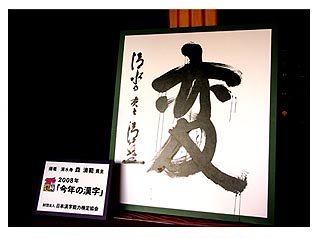 毎年年末になると、なぜか清水寺の森清範貫主が筆を執り、奥の院前の舞台で一文字書き上げる。今年は、主催する「財団法人 日本漢字能力検定協会」の一般公募で過去最多の11万1,208通の応募があり1位に「変」、2位に「金」、3位は「落」が選ばれた。