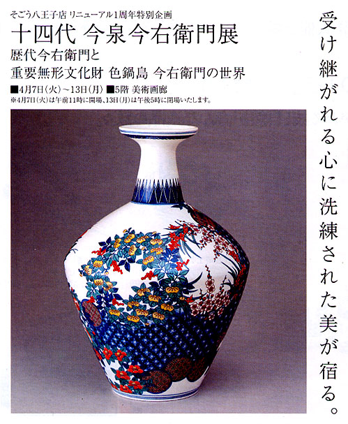 前述の「イメージの氾濫」を観た後、近所のそごう八王子店で開催していたリニューアル一周年特別企画「今右衛門展」をのぞく。以前にも自慢げに書いたが、今泉家はワタシの遠縁である。12代の兄の曾孫にあたる。