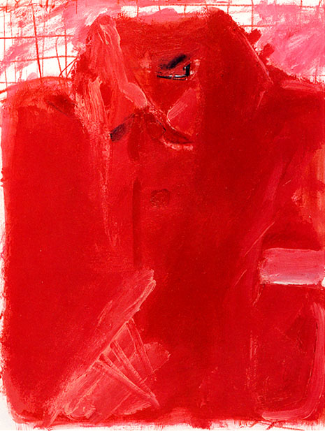 左から三宅一生との対話から生まれた「折りたたまれた赤いシャツ」( Folded Red Shirt, 1982 Acrylic and colored pencil on paper, 35.7 x 27.3 cm ) 、「Deep Color ,Side」( 1982 Acrylic and colored pencil on paper 46.0 x 38.7 cm) 「赤と青の漁夫」(Red and Blue Fishman, 1988 Lithograph, 100.0 x 74.0 cm)
