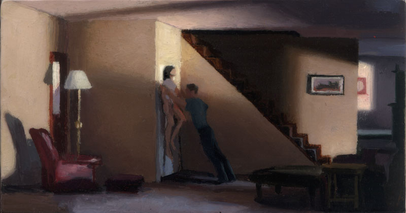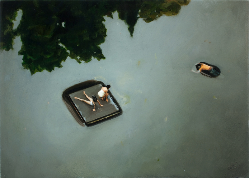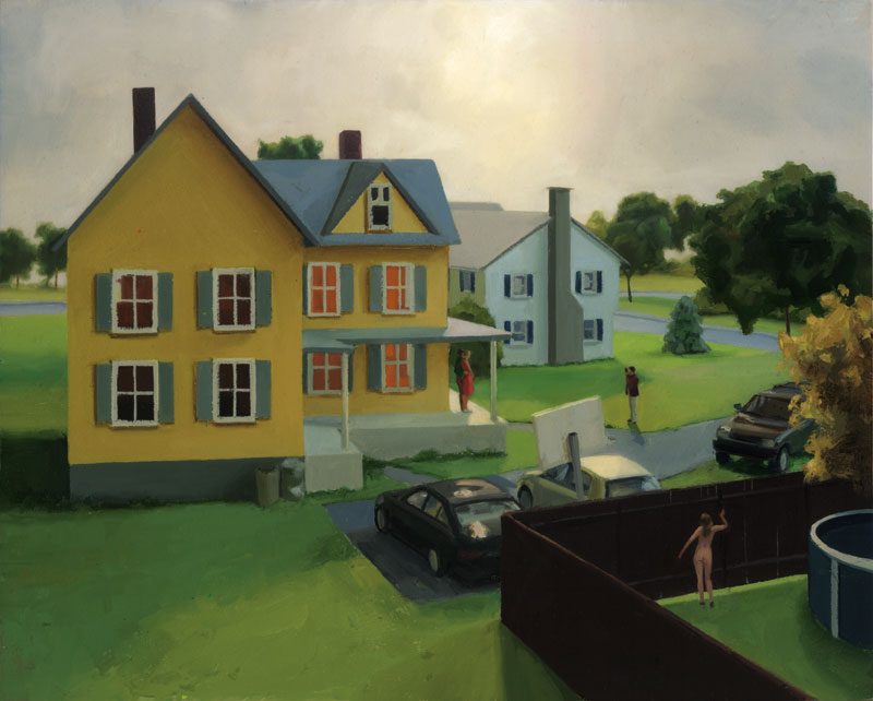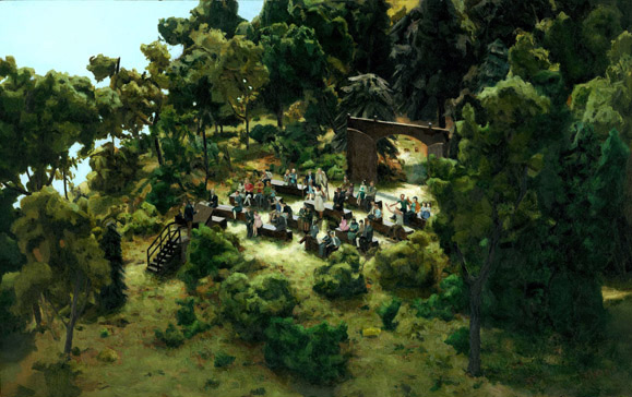 ベネットは、大きなジオラマを作り込み、その風景の中のシーンをパルネの上にペインティングする。例えばレイクシリーズというのは、その湖の周りで起こっている情景を活写する。今回の展覧会は、2008年に制作された湖のジオラマを舞台にしたシリーズで、写真のようでいて、実は細部はしっかりとした油彩で描かれている。ジオラマは、スタイロフォームで作られた4 x 1mの大きさの樹脂の湖をベースに、針金の樹木、カードボードのコテージ、模型の人々が配置されている。